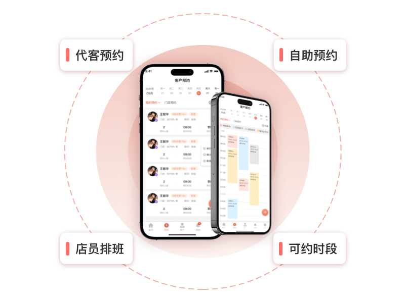 管理端、店员端(代客预约)、客户端(自助预约)一键预约,数据实时同步,省去不必要沟通成本,节省工作时间