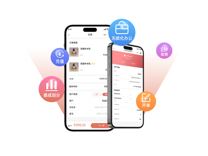 集成开单、充值、会员操作的一体无纸化收银,支持多种支付方式组合支付门店无需配备电脑收银机,一部手机即可处理,收银步骤:选择商品、选择客户、确认支付方式、结算,节省耗材成本和客户等待时间;收银详细数据可实事同步,核账可按天、周、月可查看明细数据。